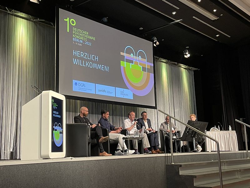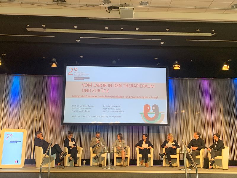 PsyChange member Anke Haberkamp participated in a panel discussion targeting translational psychotherapy together with Marcella Woud and Andre Pittig (both University of Göttingen), Tania Lincoln (University of Hamburg), Matthias Berking (University of Erlangen-Nuremberg), Ulrike Lüken (Humboldt University of Berlin). Nowadays, researchers purse different ways of optimizing existing psychotherapeutic methods or developing new ones. One way is to take greater account of basic research. We discussed the necessity and advantages, as well as current barriers of translational psychotherapy and future perspectives. The important and vivid discussion was moderated by Anja Riesel (University of Hamburg) and Jan Richter (University of Hildesheim). The discussion took part at the second German congress of psychotherapy (Berlin, 10th – 13th of May, 2023).